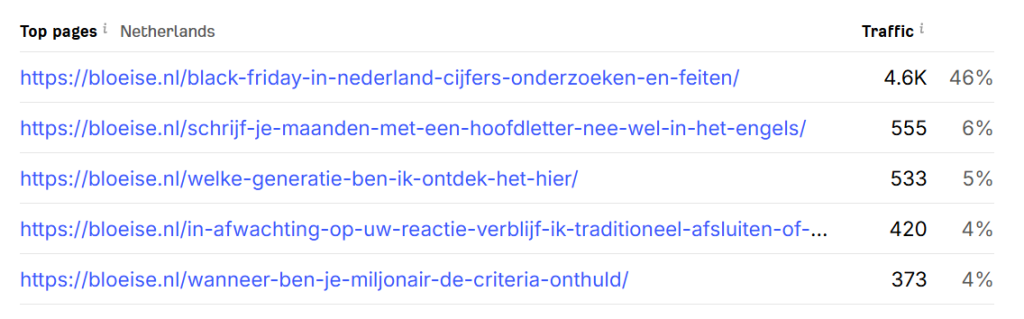 Scroll ook verder zodat je de 5 toppagina’s ziet volgens Ahrefs: