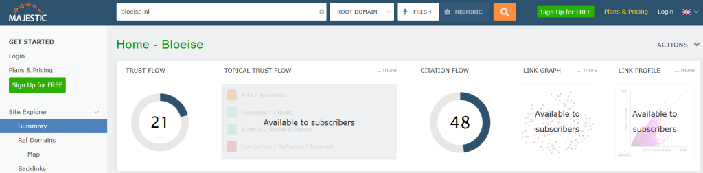 De Trust Flow (TF) van Majestic voegt nog een dimensie toe door te meten hoe betrouwbaar een website is op basis van de nabijheid tot handmatig geverifieerde betrouwbare bronnen. Een hoge Trust Flow in combinatie met een sterke Citation Flow (vergelijkbaar met DR) wijst op een natuurlijk, gezond linkprofiel. Als de Citation Flow veel hoger is dan de Trust Flow, kan dat een signaal zijn van spammy linkbuilding praktijken.